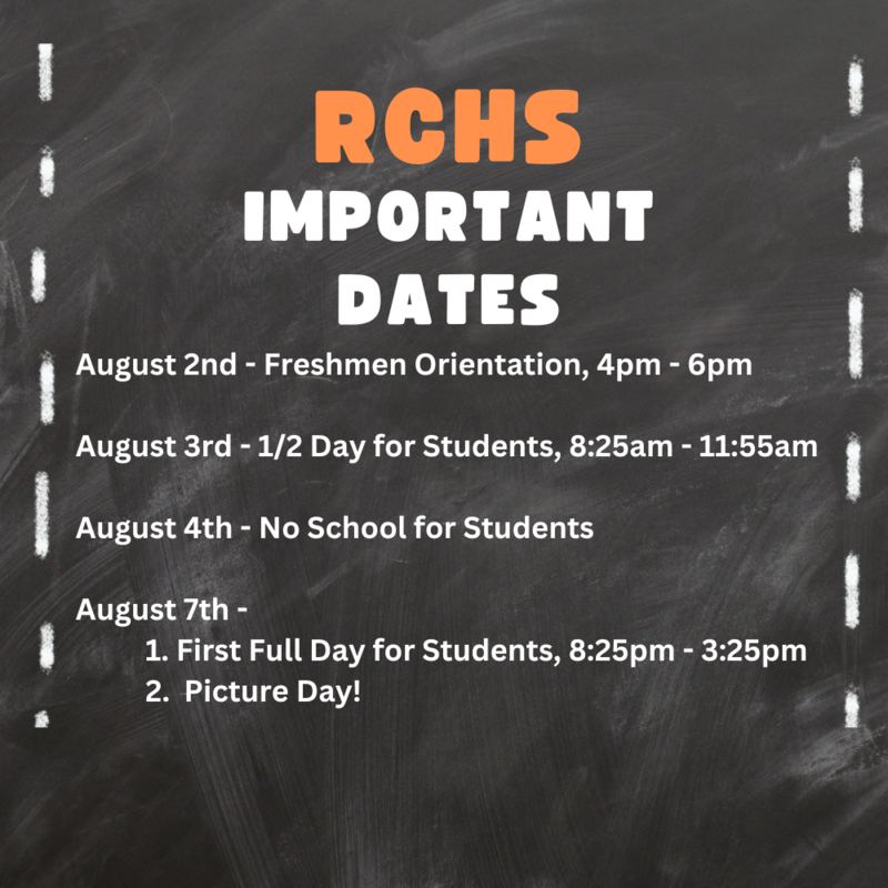 We are excited to welcome our students back to RCHS next week! Please take note of important upcoming dates. Picture day is on the first full day of school, and the students will be receiving their envelopes either at freshmen orientation or on the half day.